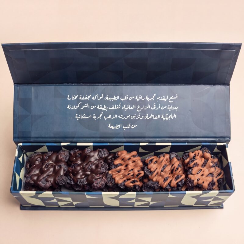 تم اختيار التوت بعناية ثم تجفيفه بطريقة تحفظ بنيته ونكهته الطبيعية، قبل أن يُغلف بالشوكولاتة البلجيكية الفاخرة، ليظهر تباين واضح بين حموضة الفاكهة ونعومة الكاكاو.