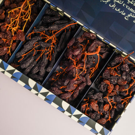 بوكس فاخر يضم أربعة أصناف 🍇 من العنب الأسترالي الطبيعي 🇦🇺 المجفف بعناقيده كما جُني من المزرعة، من دون أي سكر مضاف ❌🍬.